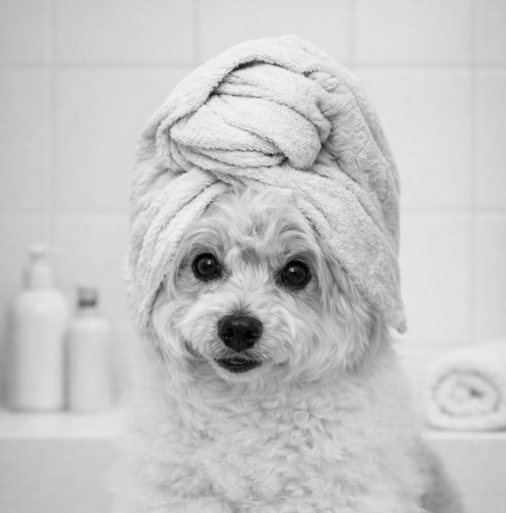 Full bath, blow-dry, brush-out, full-body haircut and style (as needed), with nail trim.