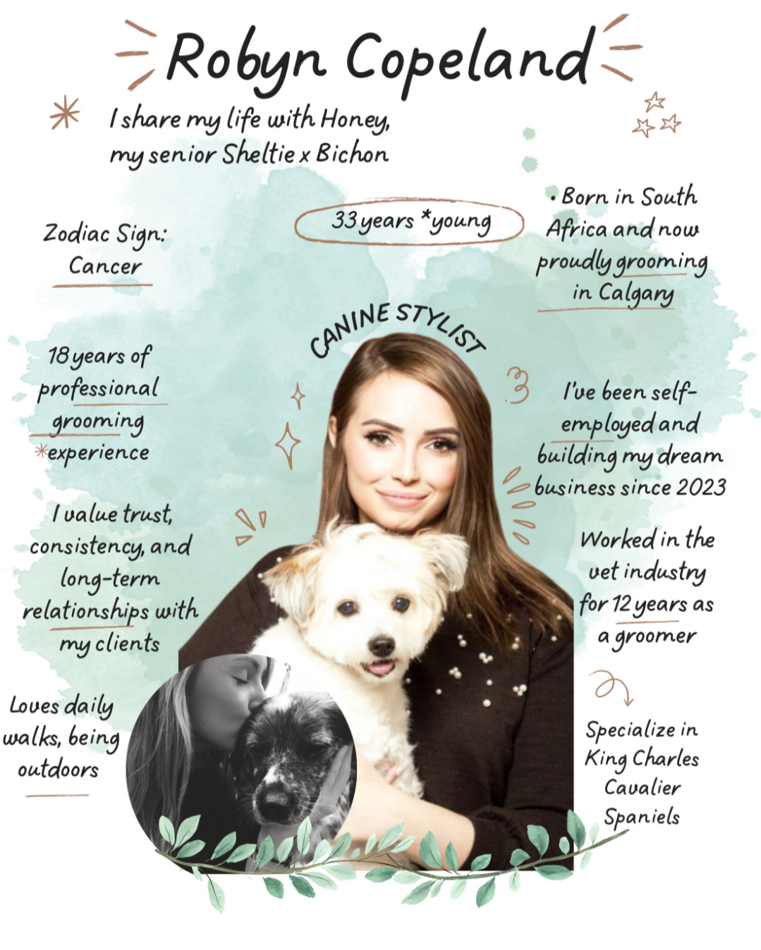 Born and raised in South Africa, I have had a lifelong love and deep respect for animals. From a very young age, I was naturally drawn to learning about different breeds, their behaviour, temperaments, and the individual needs that make each dog unique. Animals have always been a constant in my life, shaping bothmy values and the way I approach my work today.I completed my grooming apprenticeship in 2008 and began my career working in a veterinary clinic, where I gained extensive hands on experience caring for dogs of all breeds, sizes, and temperaments. Working in a clinical setting taught me far more than grooming techniques alone. It gave me a deep understanding of canine health, body language, and stress signals, and showed me how important calm, compassionate handling is for a dog’s overall wellbeing. It was during this time that I discovered my passion for providing gentle, low stress grooming experiences, particularly for dogs who may feel anxious, sensitive, or unsure.With this foundation, I continued to grow my skills and knowledge over the years, always prioritizing the emotional experience of the dog just as much as the final groom. I strongly believe that grooming should never be rushed or forced, and that trust is built through patience, consistency, and respect.In 2023, I opened my own home based salon with the intention of creating a peaceful, familiar environment where dogs can feel safe, supported, and unhurried. I wanted to step away from the busy, high volume salon model and offer something more personal.I am a certified Fear Free groomer and Alberta Force Free certified, and my approach is rooted in gentle, compassionate handling. I never use force, intimidation, or restraint based methods. Every grooming session is thoughtfully tailored to your dog’s comfort level, emotional state, and individual needs on that day. This approach not only reduces stress during grooming, but helps build long term confidence and positive associations with handling.With 18 years of professional grooming experience, I have had the privilege of caring for countless dogs throughout my career. There is nothing more rewarding to me than seeing a dog leave my studio relaxed, confident, and comfortable in their own skin. Those quiet moments of trust, tail wags, and calm body language are what make this work so meaningful.When I am not grooming, I enjoy spending time with my own dog, Honey, and exploring the beautiful outdoors of Alberta. I also love expressing my creativity through painting, baking and cooking and photography. These moments of creativity and connection bring balance to my life and continually inspire the care,